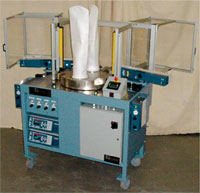 Chase Machine’s Ultrasonic Turret Ring Welder provides an alternative method of producing numerous products for varying markets and filtration requirements. The machine uses a two-position turret to fuse needle-punch or spunbound/meltblown filter bags to polypropylene or polyester rings. The two position turret allows the operator to safely load and unload material while welding a previously loaded part.